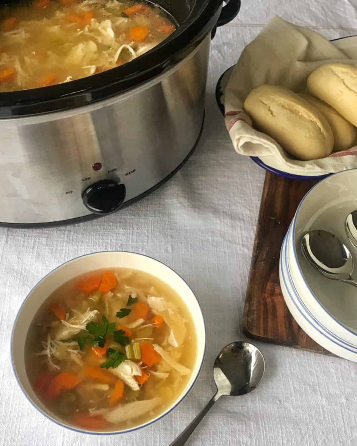 The health and nutritional benefits of chicken soup are legendary for the body and soul. There is nothing quite like a bowl of hot steaming soup in winter to heal the body and calm the mind. I love to serve my Slow Cooker Whole Chicken Soup with warm bread rolls out of the oven and of course, butter.