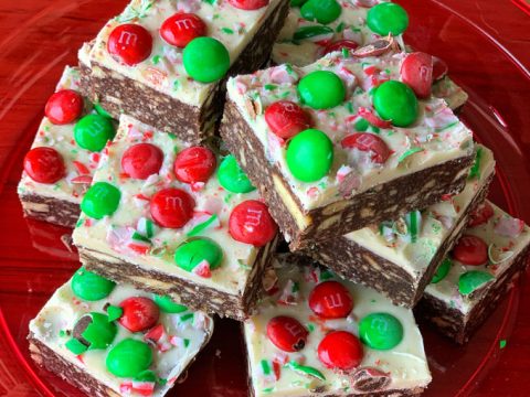 This no-bake Christmas slice has a delicious biscuit base and is topped with white chocolate, candy canes and M&Ms.
