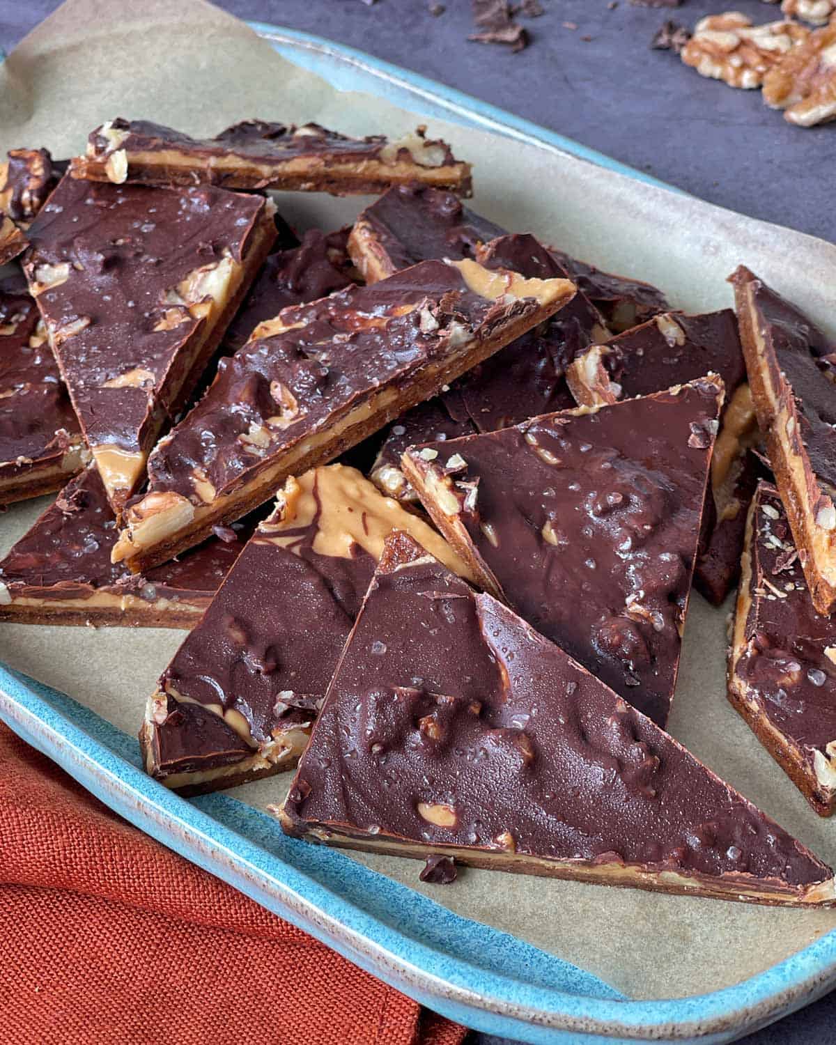 An easy, frozen sweet treat made from pitted dates, walnut pieces, peanut butter, dark chocolate and optional sea salt.