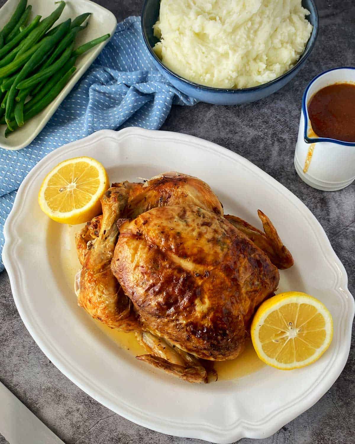 A tender and juicy Lemon Garlic Butter Roast Chicken served with homemade gravy. Add potatoes and greens for a complete meal.