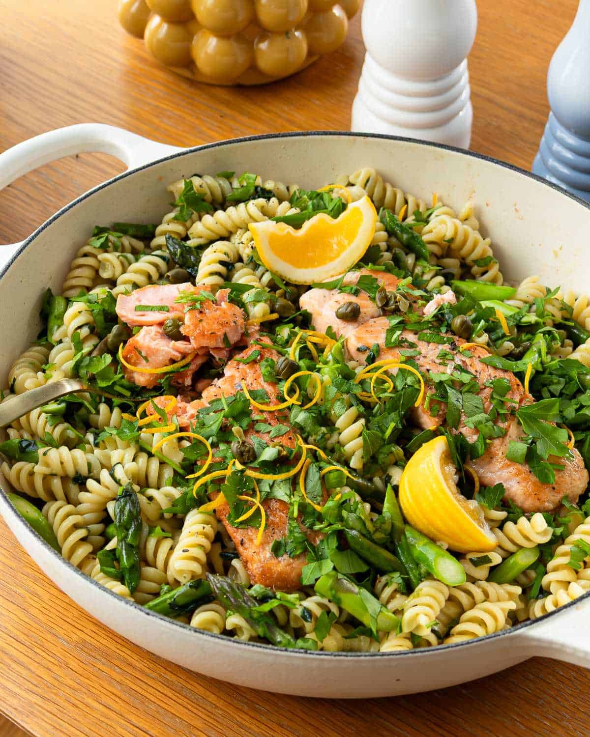 If you're wondering what Salmon Piccata Pasta is... you're probably not alone. A traditional salmon piccata comprises pan-seared salmon fillets topped with a tangy sauce made from lemon, capers and garlic, then served over pasta. I've added a spring twist to my pasta with the addition of asparagus and spinach. Top with fresh parsley for a herby finish. For another fresh pasta, be sure to check out our Courgette, Lemon and Garlic Pasta.