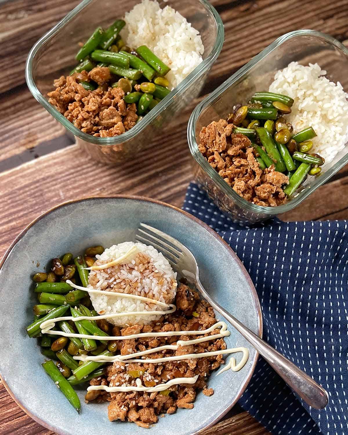 Sesame flavoured chicken mince served with freshly steamed rice and steamed green beans cooked in a sweet and salty sauce.